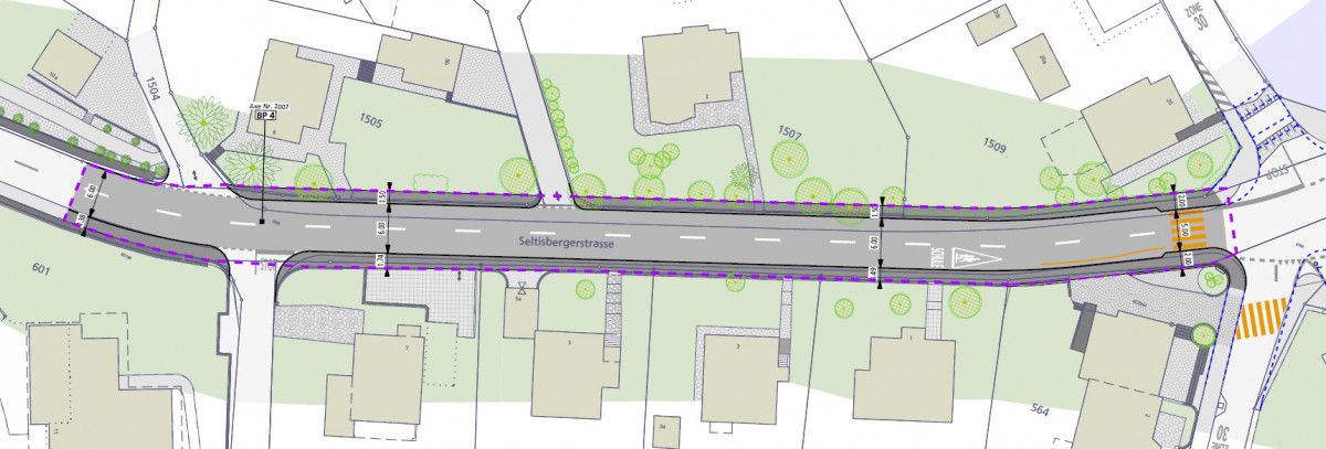 Für den Abschnitt ab dem ehemaligen «Seltisbergerweg» bis zum Wetterchrütz liegt bereits ein Bauprojekt im Entwurf vor. Hier liegt das Augenmerk ebenfalls auf der Verbreiterung der Strasse und dem behindertengerechten Ausbau der vorhandenen Bushaltestellen sowie auf dem Veloverkehr. Im Ausserortsbereich soll das vorhandene Trottoir auf die andere Strassenseite verlegt werden, damit dieses von den Velofahrenden sowie von den Fussgängerinnen und Fussgängern gleichermassen genutzt werden kann. Mit Mittelinseln soll der Geschwindigkeitswechsel von Tempo 80 auf generell 50 Kilometer pro Stunde bei den Einfahrten in die Siedlungsgebiete unterstützt werden.
