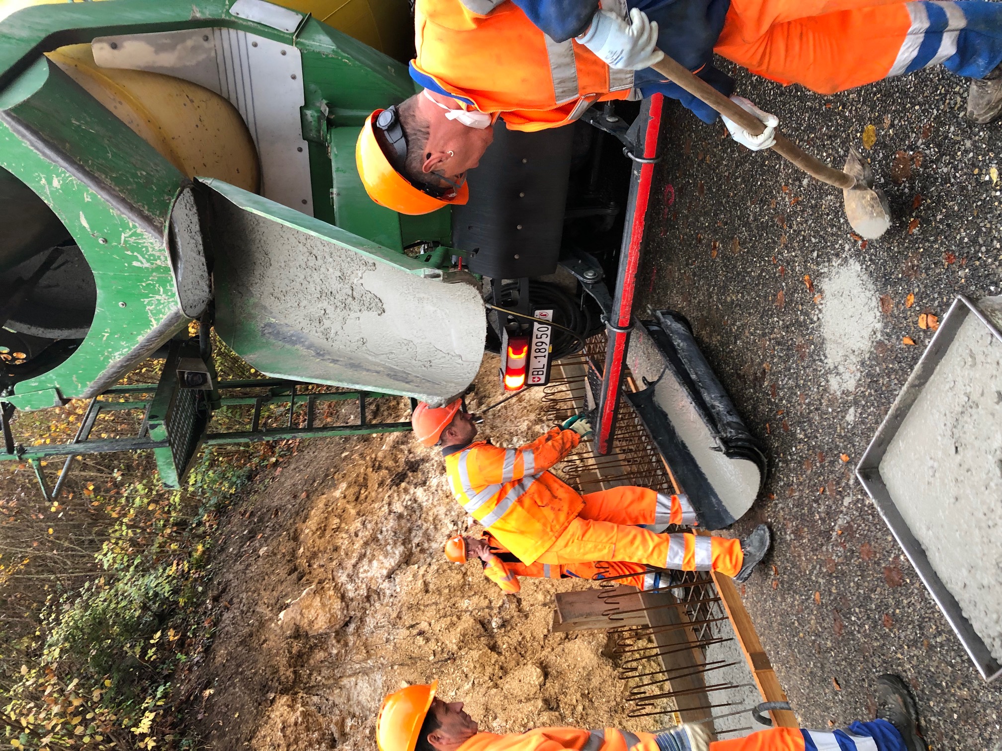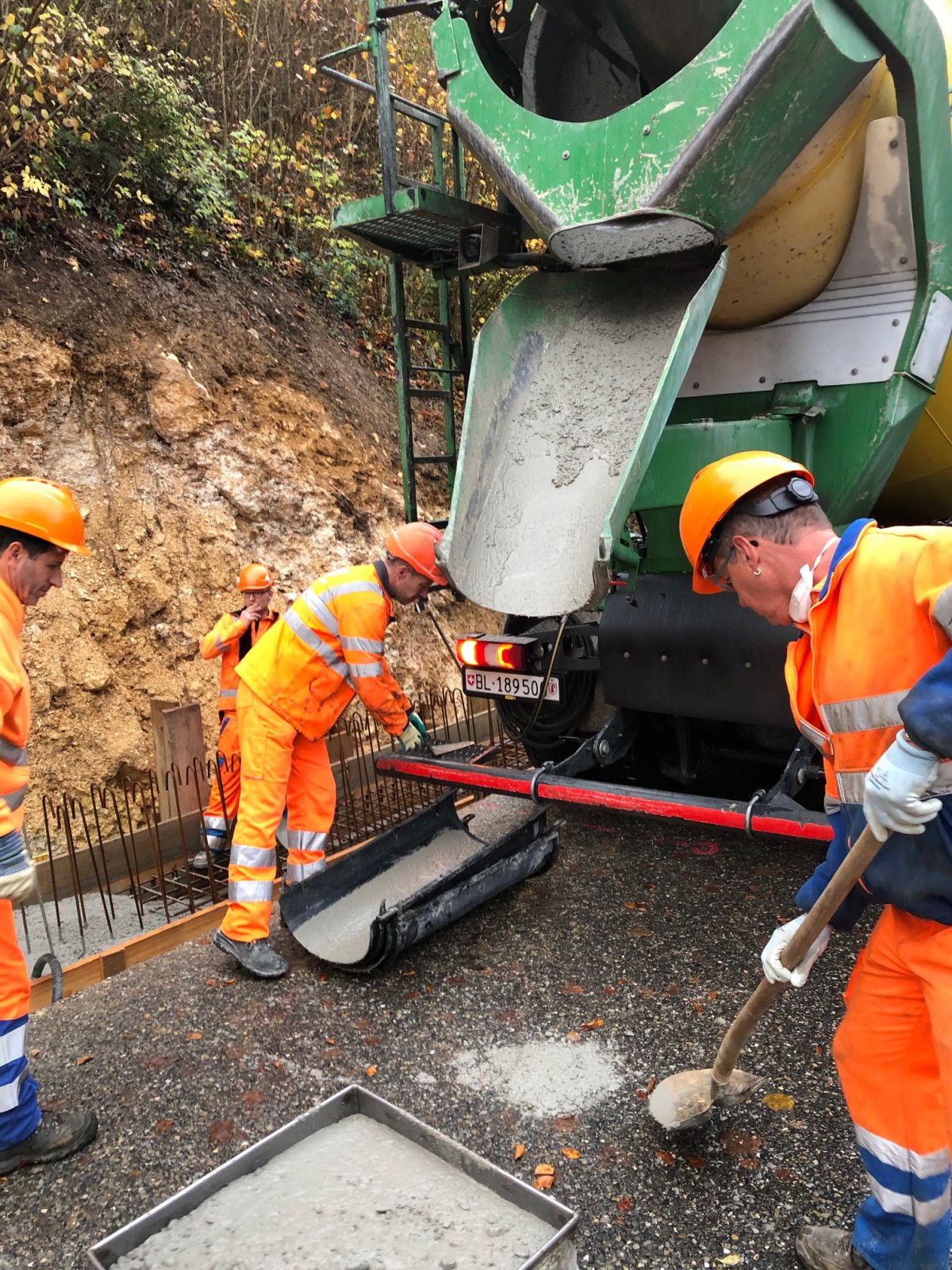 Anlieferung des RC-Beton auf der Baustelle für die  Pilotstützmauer an der Nunnigerstrasse in Grellingen (Quelle: TBA)