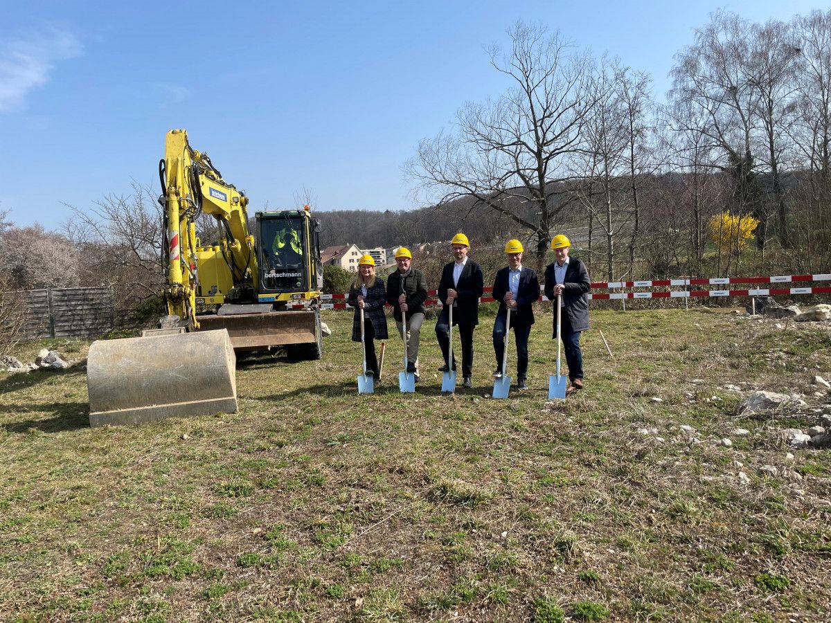 Der Spatenstich ist erfolgt:  Vlnr.: Katja Jutzi (Generalsekretärin BUD), Patrick Lüthy (Betriebsleiter, Amt für Industrielle Betriebe), Pascal Hubmann (Leiter Amt für Industrielle Betriebe ), Gerhard Koch (Stv. Leiter Amt für Industrielle Betriebe ), Sven Bittscheidt (Projektleiter, Amt für Industrielle Betriebe) (Quelle: BUZ)