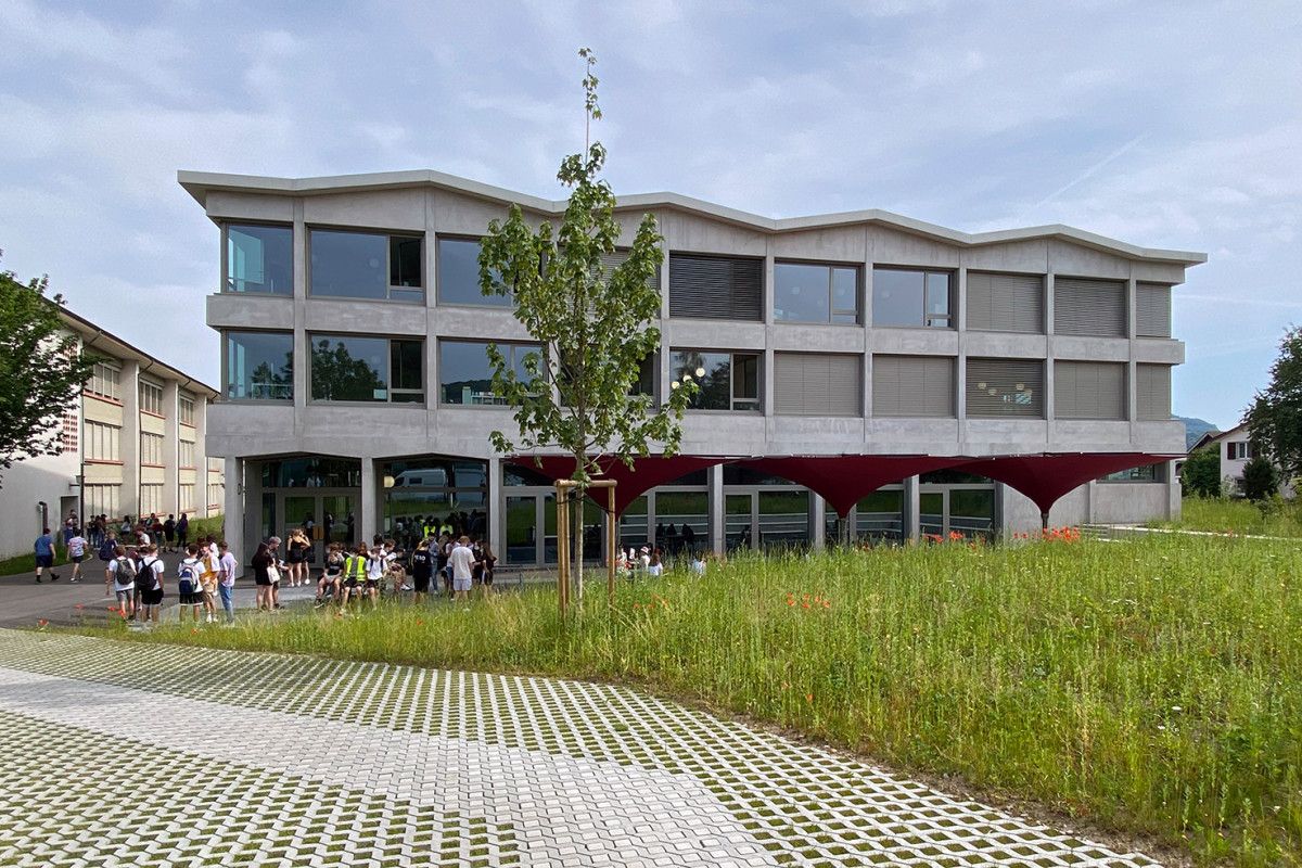 Neue halböffentliche Innen- und Aussenräume zum Verweilen in der Sekundarschulanlage Tannenbrunn in Sissach (Quelle: HBA)