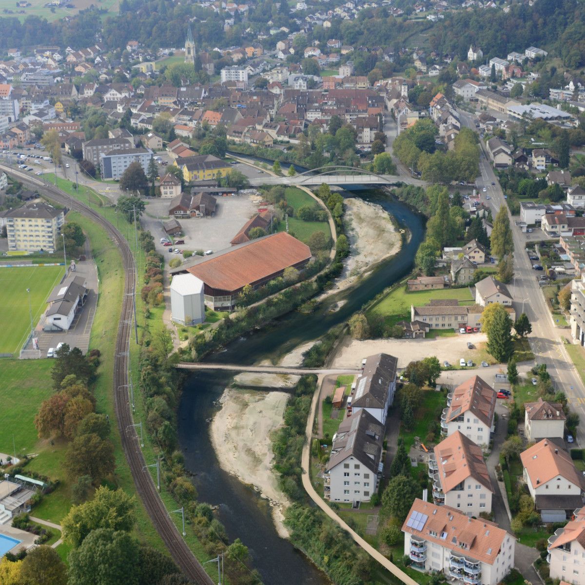 Nachher: Der Querschnitt des Flussbetts verbreitert sich in dieser S-Kurve um bis zu 30 Meter. Durch diese Massnahme sinkt der Wasserspiegel eines Jahrhunderthochwassers um bis zu einem Meter. Auf Ufermauern kann deshalb zu Gunsten des Ortsbilds der Altstadt weitestgehend verzichtet werden. Diese Aufweitung lässt eine vielfältige Fluss- und Uferstruktur entstehen. Die neue Brücke soll nicht wie im Bild dargestellt, sondern flussabwärts östlich der Eishalle errichtet werden. (Quelle: TBA).