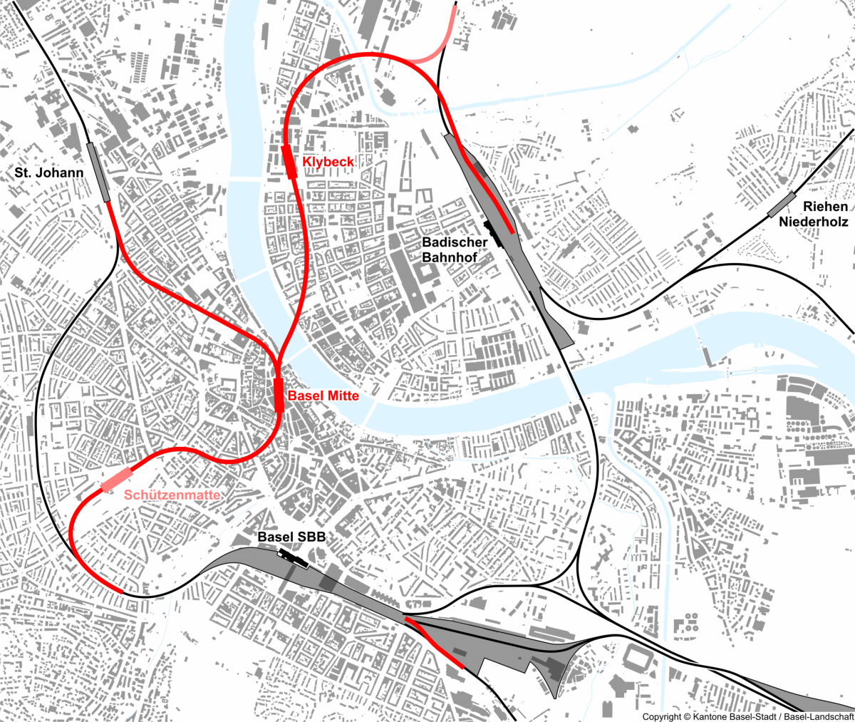 Durch eine spätere Ergänzung des Y-Asts in Richtung Bahnhof St. Johann und EuroAirport wird der Kundennutzen nochmals deutlich gesteigert. (Quelle: Konsortium Kantone Basel-Stadt und Basel-Landschaft Bahnknoten- und Herzstück-Basel)