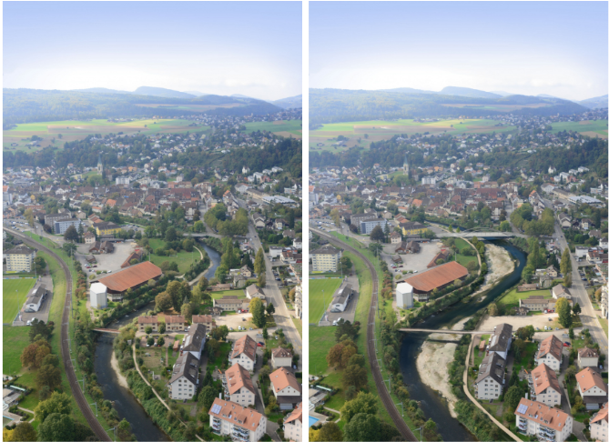 Norimatt vorher und nachher: Im Projektabschnitt Nau / Norimatt finden die offensichtlichsten Eingriffe statt, die den Charakter der Birs in diesem Streckenabschnitt völlig verändern.(Quelle: TBA)