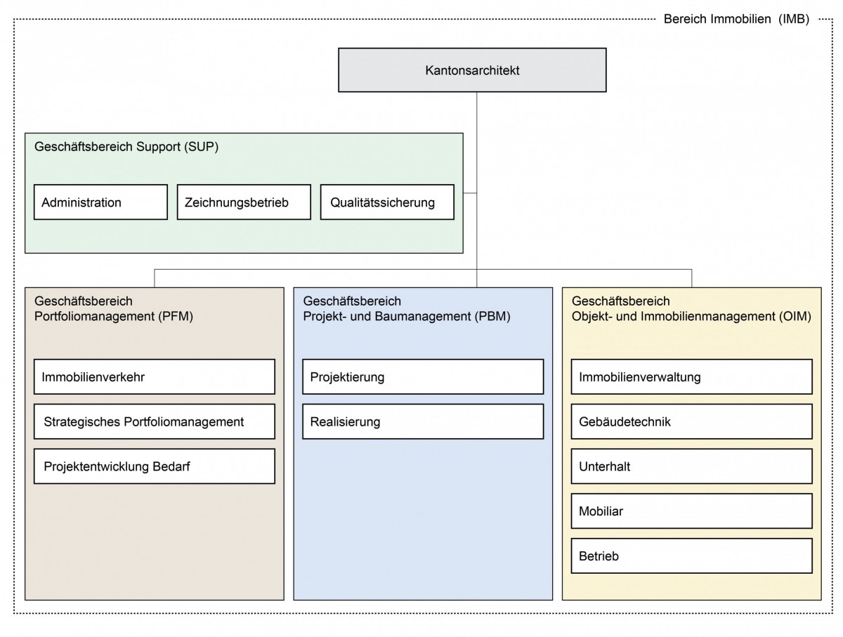 Der Geschäftsbereich Projekt- und Baumanagement (PBM) erbringt seine Leistungen insbesondere Planung und Realisierung der Bauprojekte (Neubau, Umbau, Sanierungen etc.) wie bis anhin. Im Objekt- und Immobilienmanagement (OIM) sind alle Fachbereiche zusammengefasst, welche die Leistungen für den Betrieb, Unterhalt und die Verwaltung der Liegenschaften erbringen. Im Support (SUP) werden wie bisher die unterstützenden Dienstleistungen zugunsten der Geschäfts- und Fachbereiche wie auch der Dienststellenleitung erbracht.