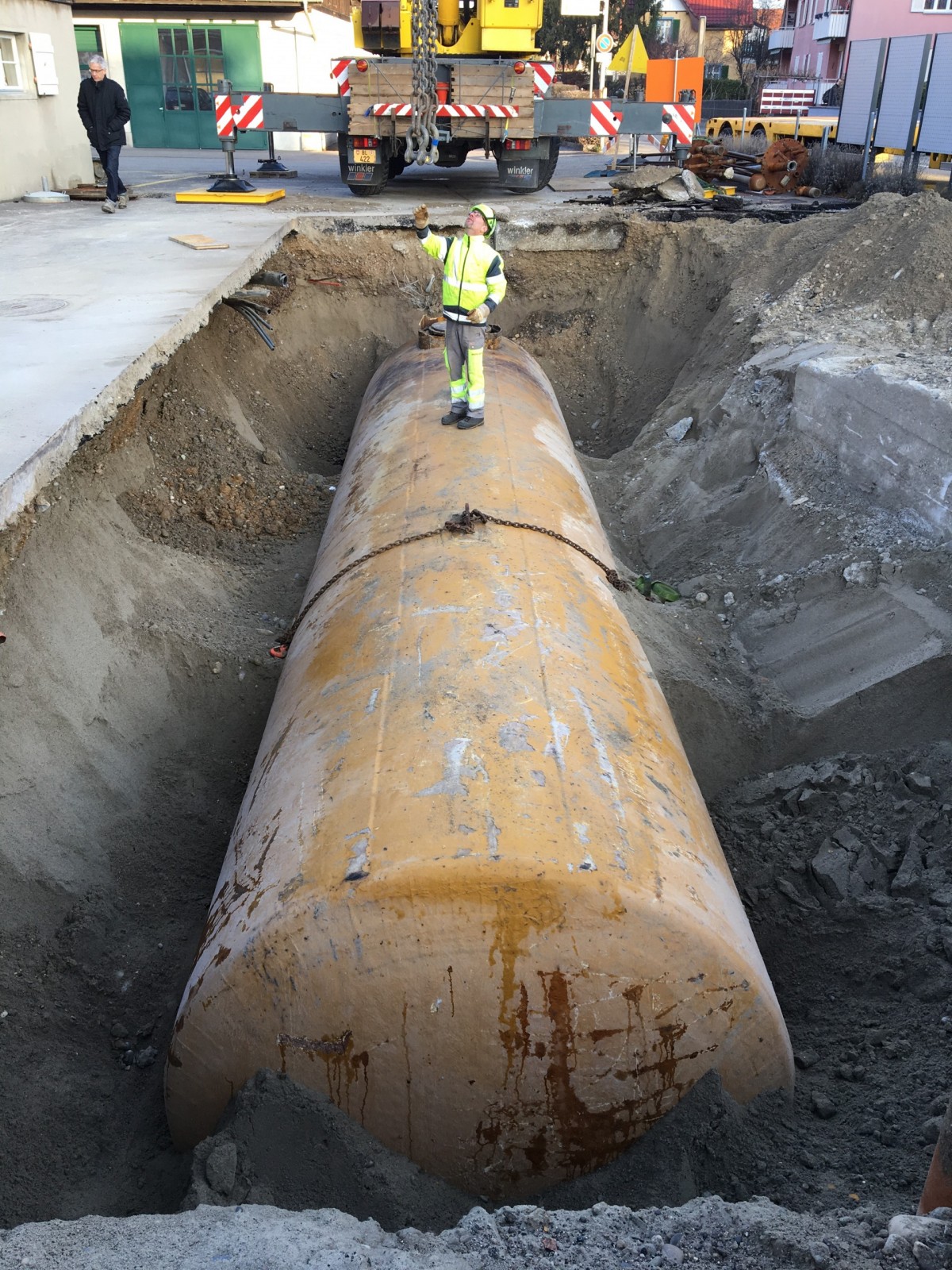 Demontage und Abtransport des alten 50‘000-Liter-Benzintanks.  (Quelle: HBA)