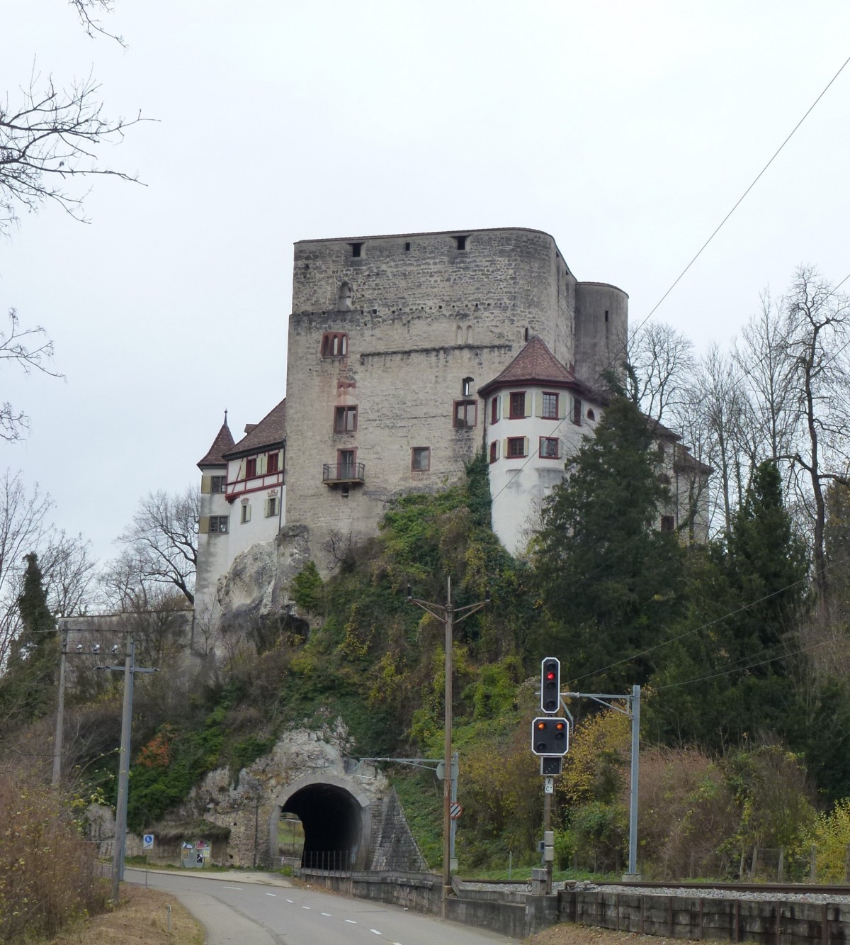 Duggingen, Schloss Angenstein: Für die Eisenbahnlinie Basel-Delsberg wurde 1875 ein Tunnel in den Schlossfelsen gebohrt. Burgenbau und Eisenbahn werden beide im Kunstdenkmäler-Band zur Sprache kommen. (Quelle: ARP)