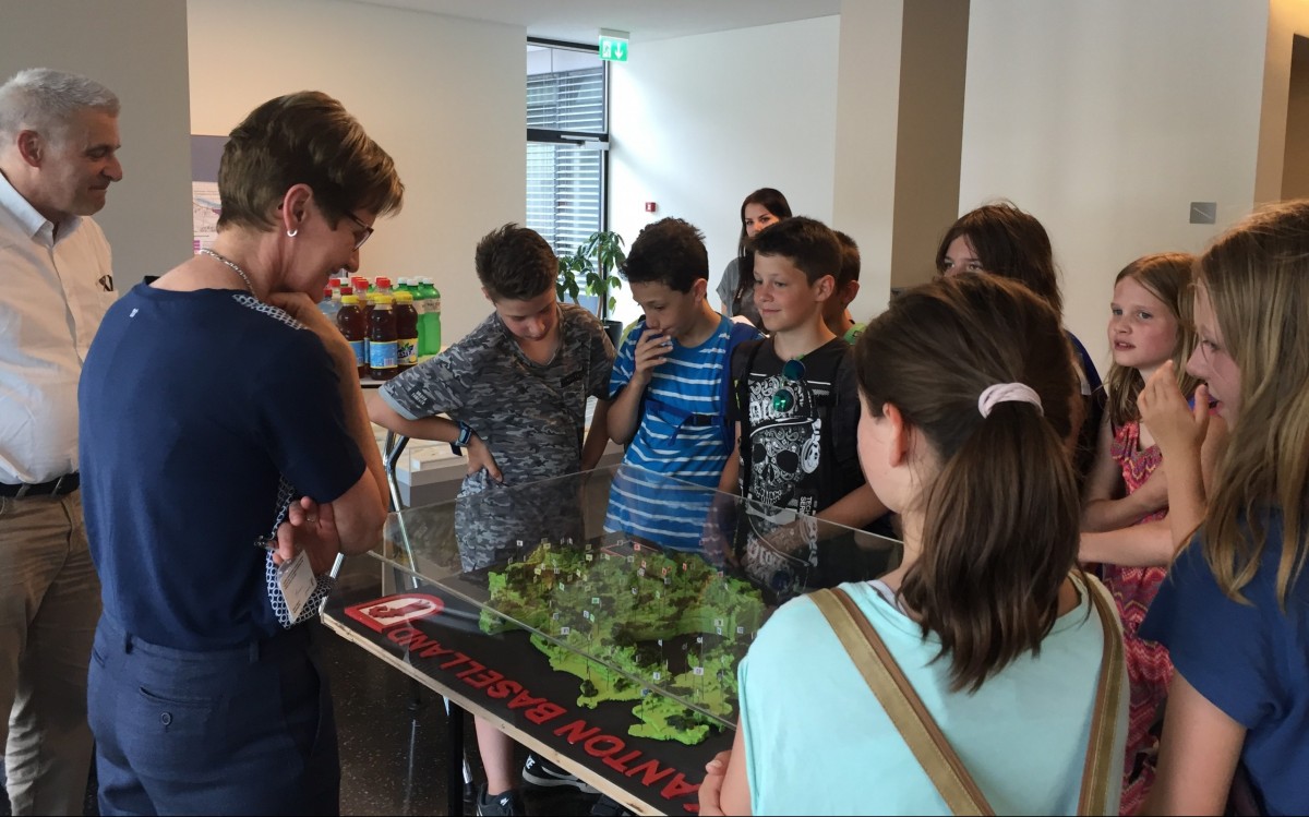 So entstand im Fach „Werken“ der 5. Klasse Lupsingen das ganze Höhenmodell des Kantons Basel-Landschaft im Zeitraum von August 2016 bis Februar 2017. Das Modell wurde koloriert, die Wälder aufgeklebt, die Gemeinden mit einem Stift mit Fahne und Nummer gekennzeichnet. Ebenso wurden ein Titel mit Flaggen und eine Legende aufgeklebt.